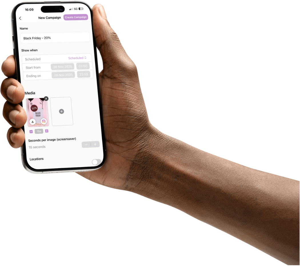 With Digmi, you create and display campaigns, offers, and content directly on screens and tablets – where your customers already are.